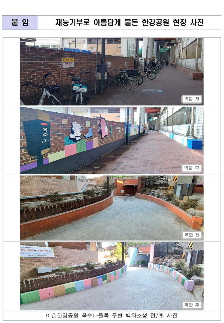 지난 2016년부터 한강공원 곳곳의 다소 낡은 시설물에 벽화를 그려 넣는 봉사활동을 실시하고 있는 서울시는 기존 벽화의 지속적인 유지·관리는 물론, 향후 추가 선정된 노후 시설물에도 벽화 및 도색을 계속 진행할 계획이다.