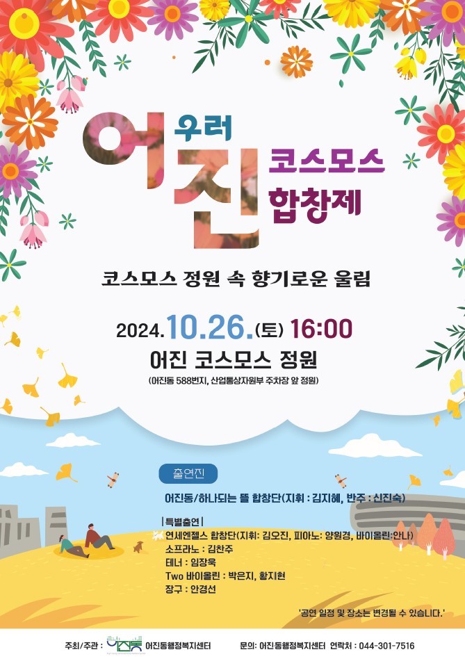 신영호 어진동장은 “합창제를 위해 열심히 준비한 합창단이 따뜻하고 감동적인 시간을 선사할 계획”이라며 “행사장에 오셔서 보랏빛 코스모스 속에서 아름다운 하모니를 만끽하시길 바란다”고 말했다.