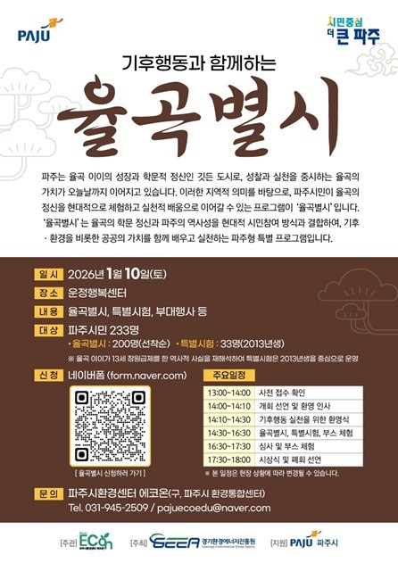 파주시환경센터 에코온 관계자는 “율곡별시는 단지 시험을 치르는 행사가 아니라, 가족과 아이들이 함께 참여하며 기후행동을 자연스럽게 경험하는 문화축제”라며 “미래세대인 청소년이 주체가 되어 기후 위기 대응의 가치를 배우고 실천으로 이어갈 수 있는 계기가 되길 바란다”라고 밝혔다.