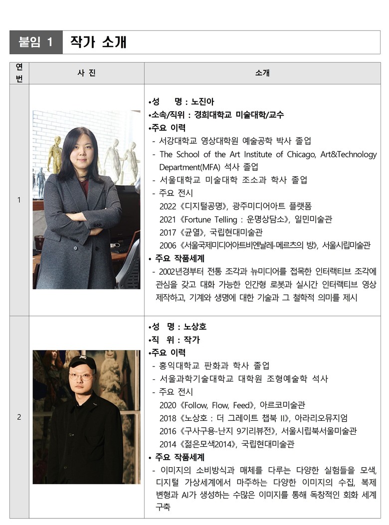 노진아 작가는 현재 경희대학교 미술대학 교수로 재직 중이며 전통 조각과 신매체를 접목한 작품을 제작한다. 인간형 로봇을 예술로 승화시키고 관객과의 소통을 중시하는 작업을 꾸준히 진행해 왔다.