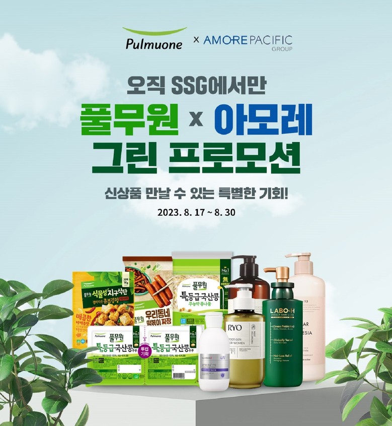 SSG닷컴에서 진행되는 ‘풀무원 X 아모레 그린 프로모션’은 상품 3만원 이상 구매시 5천원 할인을 즉시 제공하고, 기획전 동안 신제품 3종을 특가 판매한다.