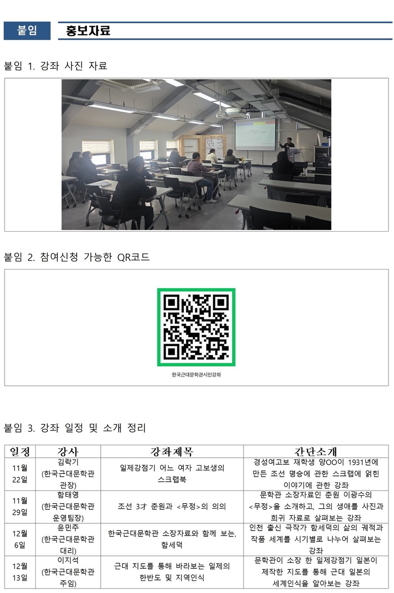 이번 강좌는 지난 11월 11일 첫 강의를 시작으로, 매주 토요일 총 4회 구성으로 진행되고 있다. 특히 외부 전문가가 아닌 문학관 내부 직원들이 직접 강사로 참여해 소장품 연구 성과를 시민들과 공유한다는 목표로 시작되었으며, 이에 문학관 관계자는 “소장 자료를 연구해 시민에게 다시 돌려준다는 취지의 시민 중심 프로그램이다” 라고 소개한 바 있다.