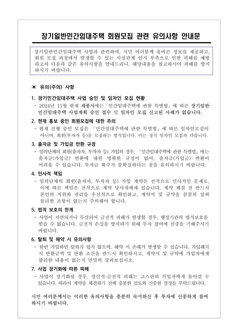 이두희 도시주택국장은 “임의 단체 회원, 출자자나 투자자 가입 계약은 당사자 간의 민사적인 문제이므로 피해 발생 시 피해 구제가 어렵다”며 “계약서상 본인의 지위, 계약금 반환 조건 등을 꼼꼼히 확인하고 임대주택에 대한 예비임차인 모집과 관련한 회원제 가입에 각별한 주의를 기울일 것을 거듭 당부한다”고 말했다.