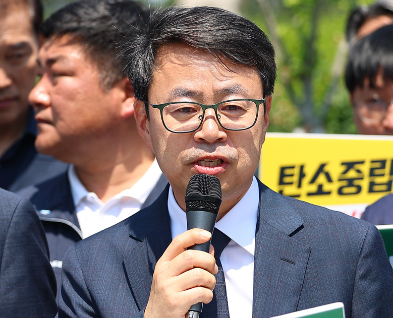 18일 오전 서울 여의도 국회 앞에서 열린 탄소중립녹색성장위원회 노동계 참여 보장 촉구 기자회견에서 민주당 박홍배 의원이 발언하고 있다.