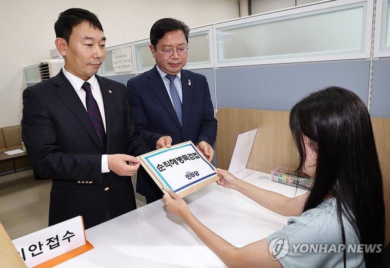 더불어민주당 김용민 원내정책수석부대표(왼쪽)와 김승원 국회 법제사법위원회 간사가 8일 오후 국회 의안과에 순직해병특검법안을 제출하고 있다. 2024.8.8