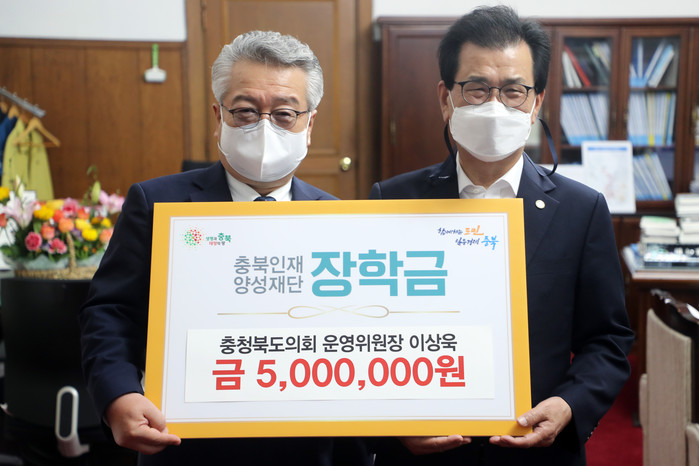 [충북=세계타임즈 이현진 기자] 충북도의회 이상욱 의회운영위원장이 7일 충북인재양성재단(이사장 이시종)에 5백만원의 장학금을 기탁했다.