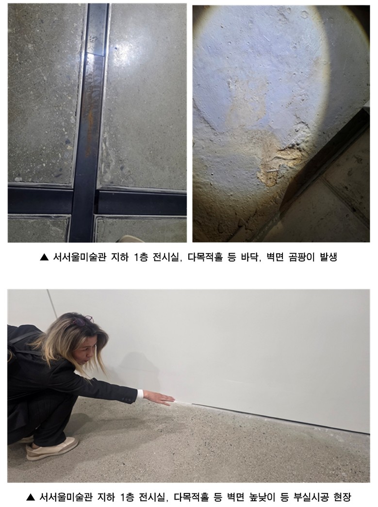 지하 1층(직원사무실 등)의 경우, 천장 누수로 감지기 오작동 및 회의실 내 곰팡이 등이 발생하는 것으로 확인되었다. 또한, 신축 건물임에도 전시가 예정된 전시실의 높은 층고는 디퓨져에서 결로 현상이 발생해 물이 고여 바닥으로 떨어지는 현상도 포착되었다. 특히, 벽면 높낮이 부실시공은 물론, 다목적홀 벽체 인젝션 주입 시, 물이 튀는 현상 또한 확인해, 시공사의 공사 과정의 허술함이 여실히 드러났다.
