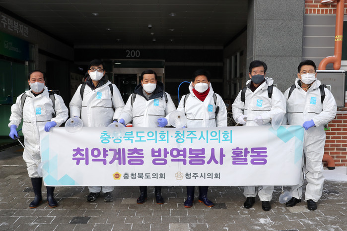 박문희 의장은 “연말연시를 맞아 코로나19로 힘든 시기를 겪고 있는 취약계층 지역주민들에게 조금이라도 보탬이 되고자 청주시의회와 함께 방역활동을 추진하게 됐다”며, “신축년(辛丑年) 새해에도 ‘가치가자*(可致訶諮)’의 정신으로 도민과 소통‧협력하며 지혜롭게 해결해 나가는 충북도의회가 되겠다”고 말했다.