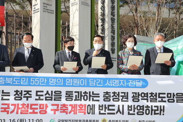 한편 충북도의회는 지난 1월 25일 청주시의회와 공동으로 지지 성명을 발표하고, 지난 2월 5일 최충진 청주시의회 의장을 비롯한 시민사회단체 관계자 등과 국토부를 방문해 충청권 광역철도망 반영을 위한 건의문을 전달했다.
