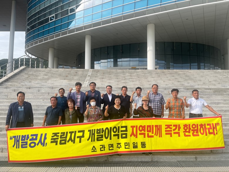 ▲ 여수시 소라면 지역 주민들과 도의회 앞 사진 |