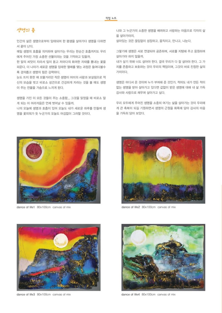 전시 주제 "생명의 춤"은 인간의 삶과 생명의 경이로움을 탐구한다. 박관희 작가는 요람에서 시작되는 생명의 여정과 한 알의 밀알이 자연의 요소들을 통해 생명을 얻는 과정을 작품에 담았다.