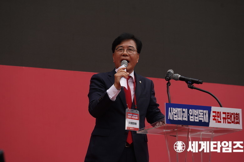 '송언석' 국민의힘 원내대표가 28일 서울 중구 시청역 인근에서 열린 사법파괴·입법독재 국민 규탄대회에서 규탄사를 하고 있다.