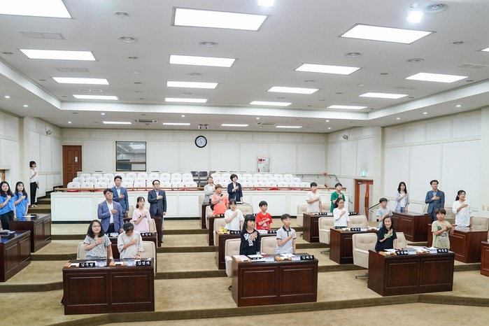 이후 학생들은 의장과 의원, 공무원으로 역할을 분담해 5분 자유발언, 안건상정을 비롯한 토론 및 질의 응답 등 실제 의사진행과 동일한 시나리오로 임시회를 개회하고 부의된 안건을 의결하는 등 모의의회를 직접 체험하는 소중한 시간을 가졌다.