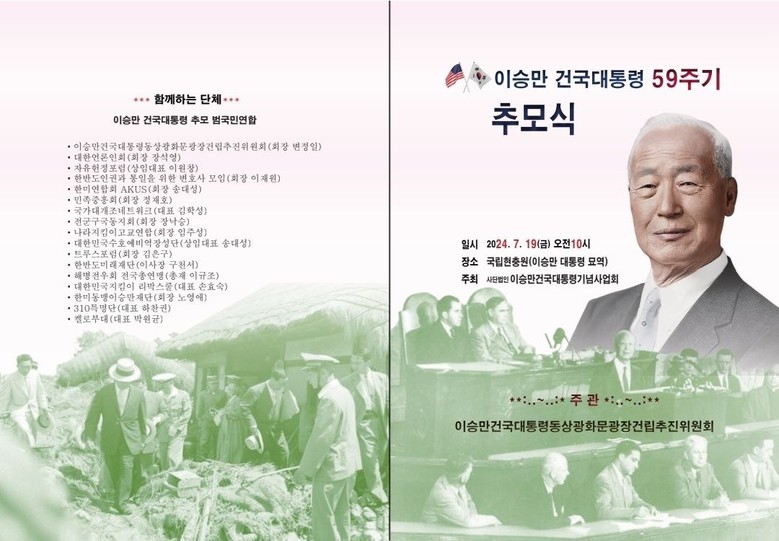 이달 19일 대한민국 건국대통령 이승만 박사 서거 59주기를 맞이해 현충원에서 서거 59주기 추모식이 진행될 예정이다.