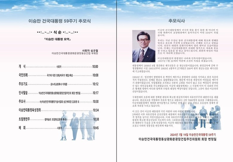 또한 "20여 사회단체와 뜻을 모아 추모식을 개최하니 이 대통령의 업적을 기리는 자리에 많은 분들이 뜻을 함께 해주실 것을 간절히 앙망한다"고 덧붙였다.