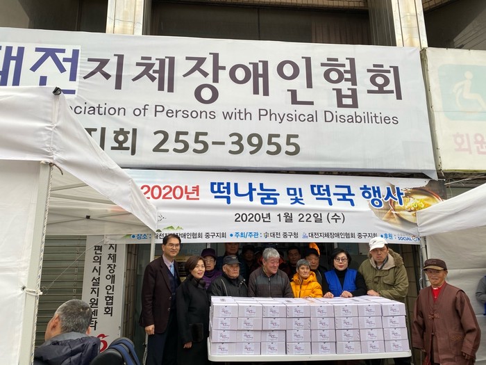 [대전=세계타임즈 이채봉 기자] 추운날씨에도 다양한 봉사를 꾸준히 하고 있는 대전시 SNS 봉사단체 사랑의 사다리 밴드(리더 이정제)는 22일 오전10시, (사)대전시지체장애인협회 중구지회(회장 김채린)의 2020년 떡나눔 및 떡국행사에서 점심급식 봉사와 바비큐 통닭 봉사로 우리 사회의 따뜻한 사랑을 전달 하였다.