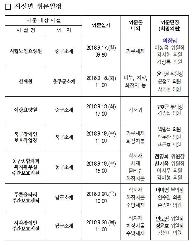 위문 일정으로는 첫 날인 9월 17일 오전 9시 50분에는 황세영 의장 및 이상옥 의원, 김성록 의원, 김시현 의원이 중구 소재 노인시설인 ‘시립노인요양원’을 방문하여 위문・격려한다.