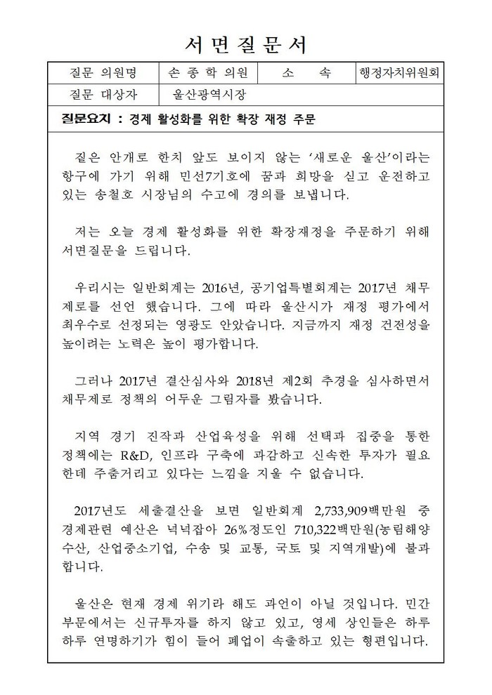 [울산=세계타임즈 이호근 기자] 울산시의회 손종학의원은 지역 경제 활력화를 위한 확장재정을 주문하기 위해 서면질문을 하였다.