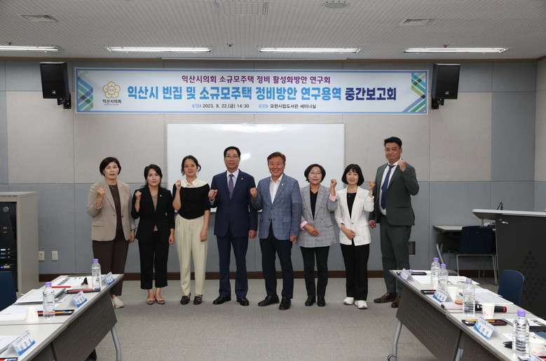 [익산 세계타임즈=이정술 기자] 익산시의회 의원연구단체 「소규모주택 정비 활성화방안 연구회(대표의원 김충영)」는 지난 9. 22.(금) 「익산시 빈집 및 소규모주택 정비방안 연구용역」 중간보고회를 가졌다고 밝혔다.