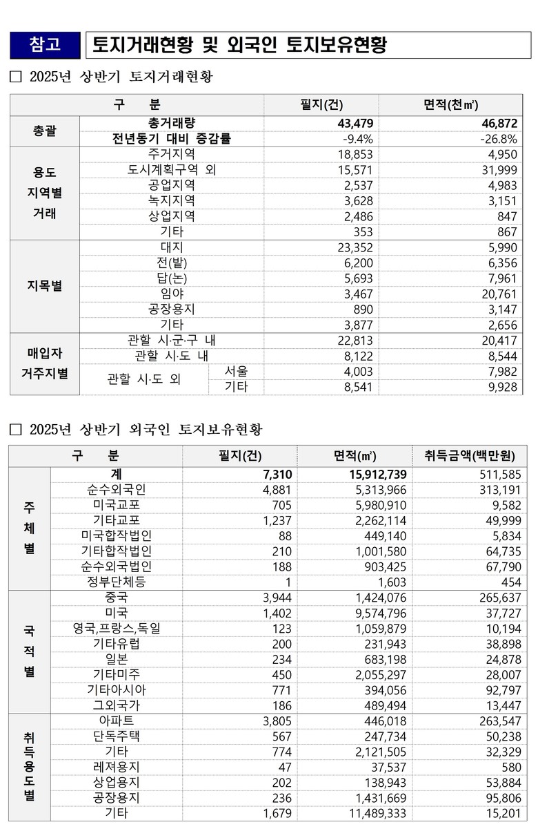 2025년 상반기 충북의 토지 거래는 총 43,479필지, 46,872천㎡로, 전년도 동기(47,991필지, 64,028천㎡) 대비 각각 9.4%(4,512필지), 26.8%(17,156천㎡) 감소했다.