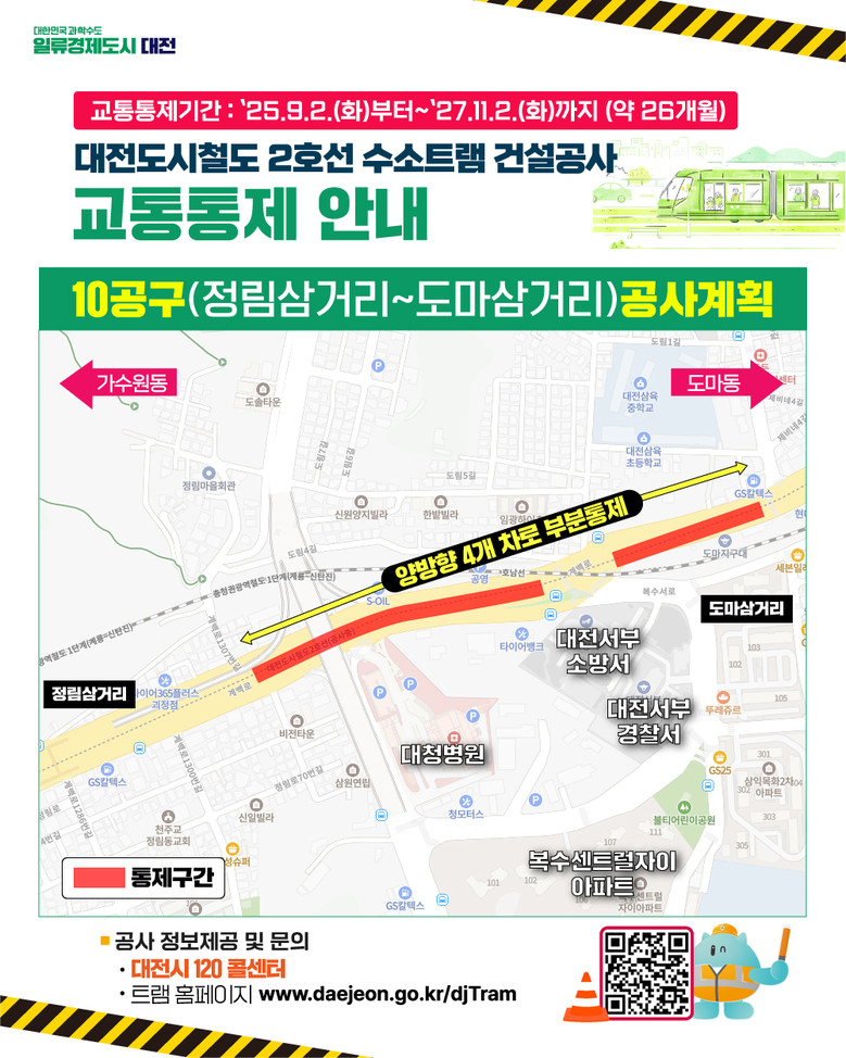 시는 공사 기간 중 시민 불편을 최소화하기 위해 공사 구간별 부분 통제를 시행하고, 우회도로를 안내하고 있다. 정확한 공사 일정과 교통 상황은 대전트램 홈페이지(https://www.daejeon.go.kr/djTram)와 시 공식 SNS를 통해 확인할 수 있다.