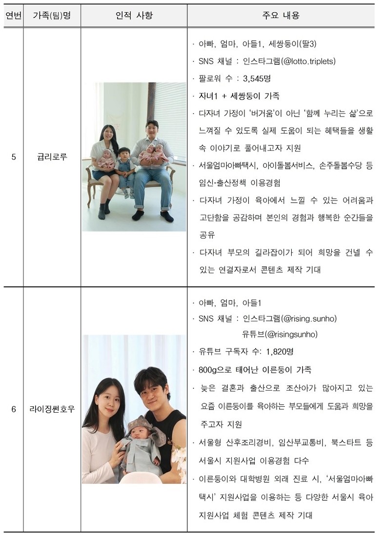 # “연예인이 아닌 두 아이의 엄마로서 친근한 모습을 통해 늦은 나이에도 건강하게 임신과 출산을 해낼 수 있었던 비결과 육아의 기쁨을 많은 분들과 나누고 싶습니다.” -반짝반짝 우주별 가족- # “아이가 있어 모든 순간이 세상에서 가장 소중한 행복임을 느끼고 살아갑니다. 서울시의 따뜻한 정책 덕분에 더 안심하고 아이를 품을 수 있었고, 어려움 속에서도 웃을 수 있었습니다. ‘아이를 낳고 기르는 게 정말 행복한 일’이라는 메시지를 여러분께 전달하고 싶습니다.” -걸리버패밀리 가족- # “24주 6일 예고도 없이 800g으로 태어난 우리 아이는 이른둥이 아기입니다. 늦은 결혼과 출산으로 조산이 급격하게 많아지는 요즘, 우리 아이의 이야기가 많은 이른둥이와 부모들에게 도움과 희망이 되었으면 좋겠습니다.” -라이징썬호우 가족- # “‘효리네 민박' 출연 당시, 서로를 아끼던 예비부부의 모습으로 많은 분께 따뜻한 응원을 받았던 저희가 어느덧 서울에서 두 아이를 키우는 6년 차 부모가 되었습니다. 저희의 시작을 지켜봐 주셨던 분들께, 서울이라는 든든한 울타리 안에서 얼마나 화목한 가정을 꾸려가는지 보여드리고 싶습니다.” -조이네민박 가족- |