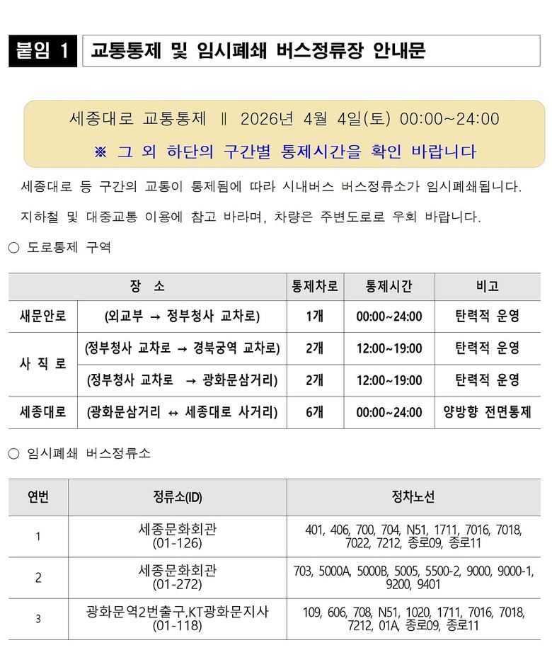 - 서울시, 4일 0시~24시 세종대로 전면 통제 및 그 외 일부 차선 통제 등 안전대책 시행