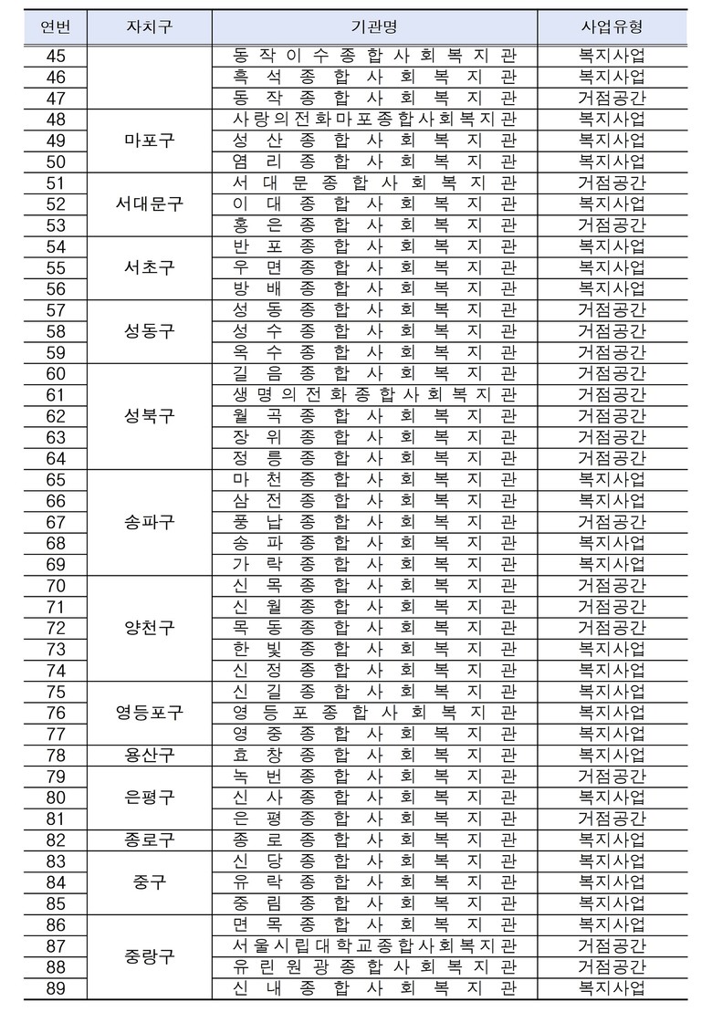서울시는 지역 내 공간을 발굴·조성 후 각종 복지사업·서비스·프로그램을 제공하는 거점공간형 31개소와 지역으로 나가서 민관협력체계에 기반한 동별 특화사업을 진행하는 복지사업형 58개소를 운영하고 있다.
