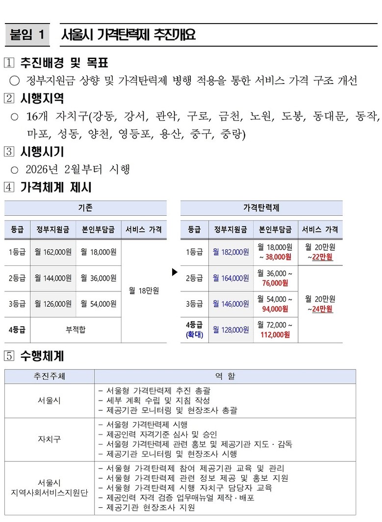 이번 가격탄력제에 참여하는 자치구는 총 16곳(강동·강서·관악·구로·금천·노원·도봉·동대문·동작·마포·성동·양천·영등포·용산·중·중랑)으로, 제공기관 현황은 서울시 지역사회서비스지원단 누리집(csi.welfare.seoul.kr/front/info/listNotice.do) 내 공지사항을 통해 확인할 수 있다.