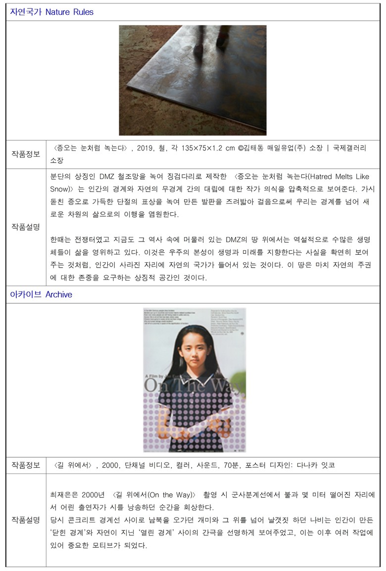 ○ [자연국가] -‘자연국가’에서는 DMZ를 인간의 분단 경계가 아닌 자연이 지배하는 공간으로 재사유한다. 〈대지의 꿈(Dreaming of Earth)〉 프로젝트와 〈자연국가(Nature Rules)〉를 통해 DMZ의 생태 현황을 분석하고 회복을 모색하는 구상을 제시하며, 국제 협업으로 구축된 아카이브 영상과 종자볼 전시, 관람객 참여형 플랫폼(https://naturerules.net/)을 함께 선보인다. 더불어 DMZ 철조망을 녹여 제작한 〈증오는 눈처럼 녹는다(Hatred Melts Like Snow)〉는 인간이 만든 경계와 자연의 무경계 사이의 대립을 상징적으로 드러내며, 경계를 넘어 새로운 삶의 가능성을 사유하게 한다.