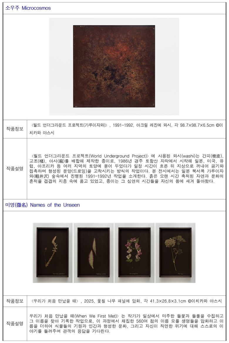 ○ [소우주] -‘소우주’에서는 대지의 안팎에 존재하는 미시 세계로 시선을 확장한다. 땅속에 묻혔다가 다시 드러난 일본의 전통 종이 ‘와시’ 작업 〈월드 언더그라운드 프로젝트(World Underground Project)〉와 이를 현미경으로 포착한 <순환(Cycle)>, 암석 위에 축적된 생명의 흔적을 담은 <숨을 배우는 돌(Stone that Learned to Breathe)>을 통해, 시간의 층위와 생명 간 상호작용, 그리고 미시 세계에 깃든 순환의 질서를 조망한다.