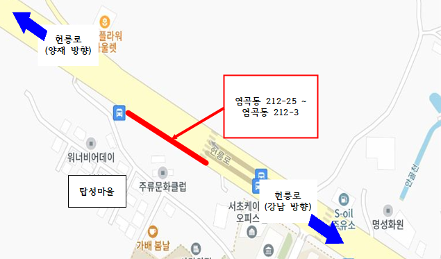 이번 사업은 보행 불편과 도시미관 저해 문제를 해소하기 위해 추진됐다. 해당 구간은 지역 내 헌릉로(염곡동 212-25~212-3) 약 150m 구간으로, 폭 2.5~3.0m의 보행로가 경사지고 노후화되어 보행 불편은 물론 미끄럼 사고 위험이 높다는 민원이 지속적으로 제기된 바 있다. 주민의견 수렴 결과 주민 91%가 찬성한 이번 사업은 구의 노력으로 공사비 전액 시비를 확보해 지난해 10월부터 추진됐다.