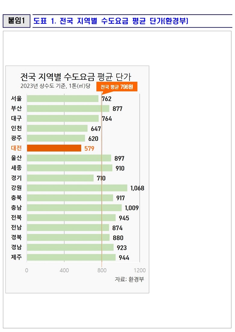환경부가 최근 공개한 상수도 통계 기준(2023년도) 「전국 지역별 수도요금 평균단가」에 따르면 대전의 평균 수도요금은 톤(㎥)당* 579원으로 전국 수돗물 평균 단가인 796원 보다 27%가 낮고 전국 17개 시.도 중 가장 저렴한 것으로 확인됐다. <도표1>