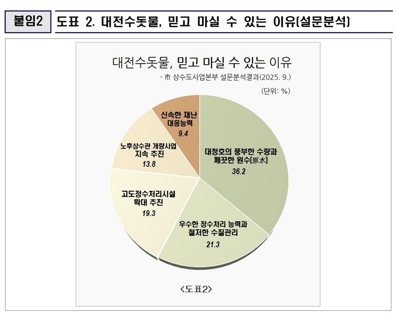 이 같은 원인에 대해 대전시 상수도사업본부는 식수원인 대청호의 풍부한 수량과 깨끗한 원수, 그리고 우수한 정수처리 능력이 결합되어 수량, 수질, 가격의 삼박자를 갖춘 전국 최고의 물관리 역량 때문인 것으로 분석하고 있다.
