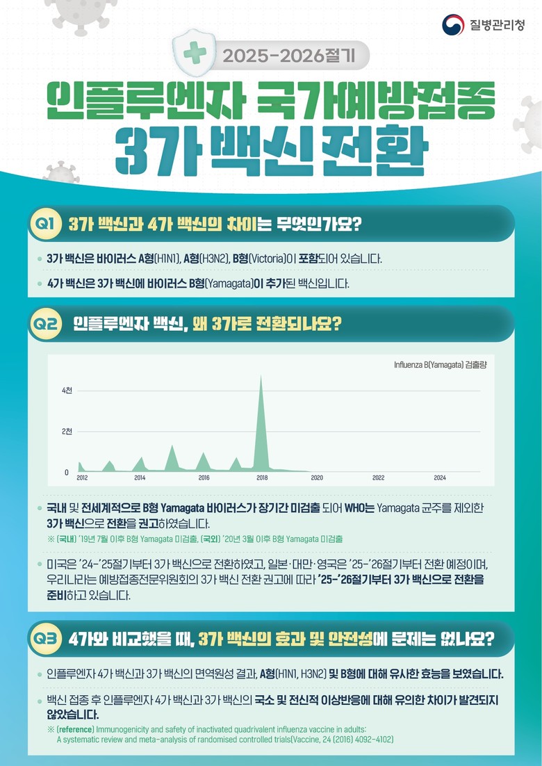 이번 2025-2026절기 독감 예방접종의 특징은 3가 백신을 사용한다는 점이다. 세계보건기구(WHO)와 예방접종 전문위원회의 권고에 따라 기존 4가 백신에서 3가 백신으로 사업을 전환했다.