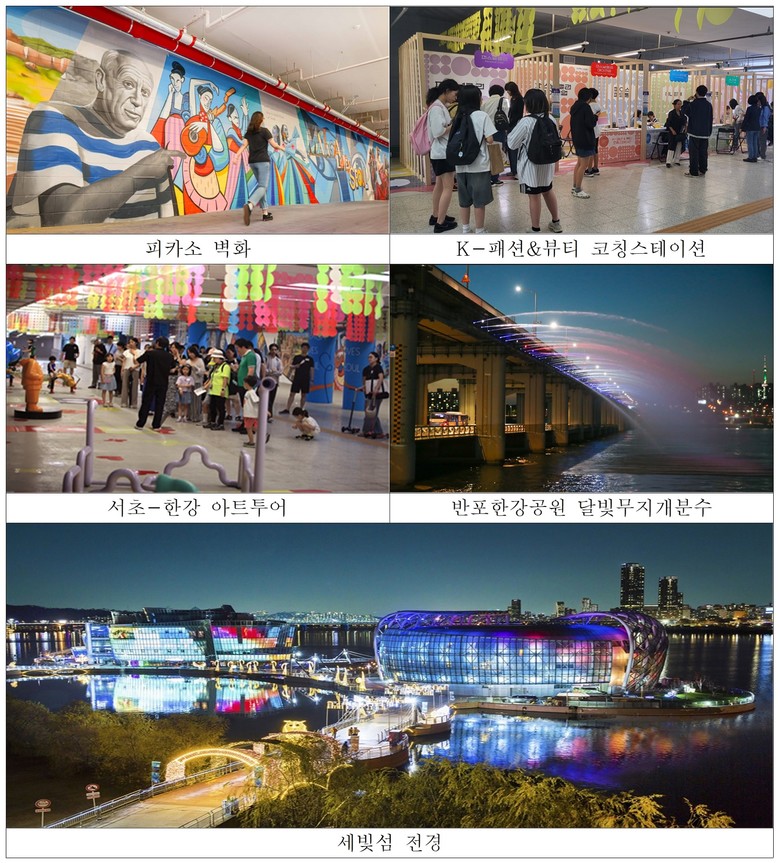 한강으로 가는 통로이자 고속터미널과 반포한강공원을 잇는 지하 공공보행통로는 ‘걸으며 즐기는 미술관’으로 꾸몄다. 스페인·말라가 관광청과 협업한 ‘피카소 벽화’와 24명의 작가가 서울의 하루를 시간대별로 그려 낸 ‘서울의 24시간’ 벽화를 설치해 매력적인 관광 거점으로 조성했다.
