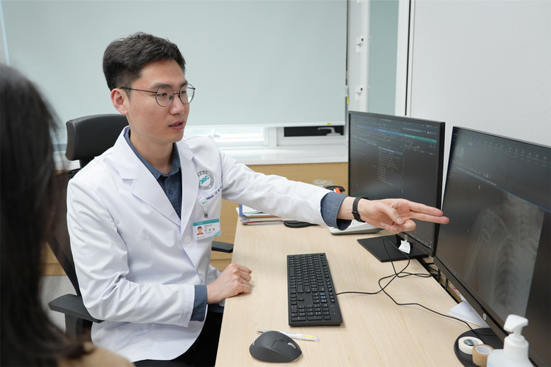 | ▲분당제생병원 정형외과 이관범 과장이 어깨 통증 환자에게 설명하고 있다.(사진=분당제생병원) |