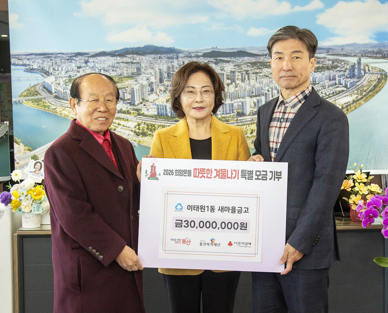 [용산구 세계타임즈=이장성 기자] 서울 용산구(구청장 박희영)는 2일 구청장실에서 이태원1동 새마을금고로부터 ‘2026 희망온돌 따뜻한 겨울나기’ 성금 3000만원을 기탁받았다고 밝혔다. 기탁된 성금은 지역 내 저소득 가구와 취약계층을 위한 긴급 생계·의료 지원 등에 사용될 예정이다.