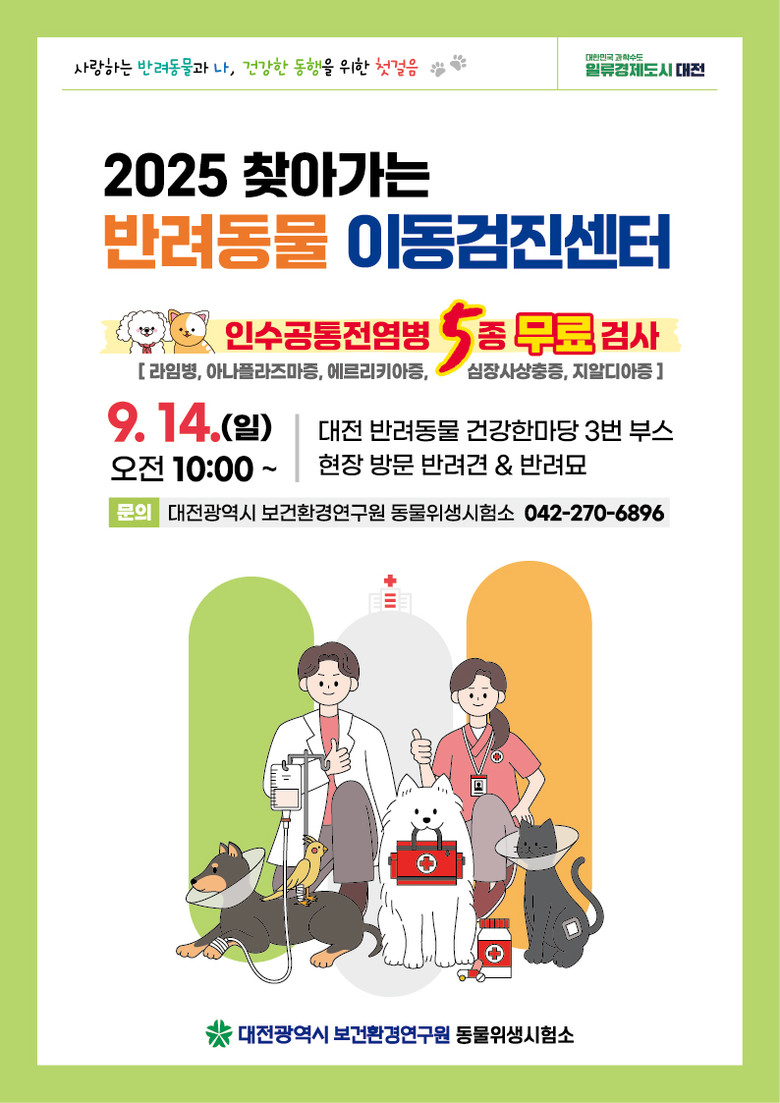 이번 이동검진센터에서는 반려동물과 사람 모두의 건강을 위해 라임병, 아나플라즈마증, 에를리키아증, 심장사상충증, 지알디아증 등 인수공통전염병 5종을 무료로 검사한다. 검사는 대전시수의사회 소속 동물병원과 공동으로 진행되며, 현장 혼잡과 안전사고 예방을 위해 시간당 30마리, 총 150마리까지 선착순으로 제한한다.