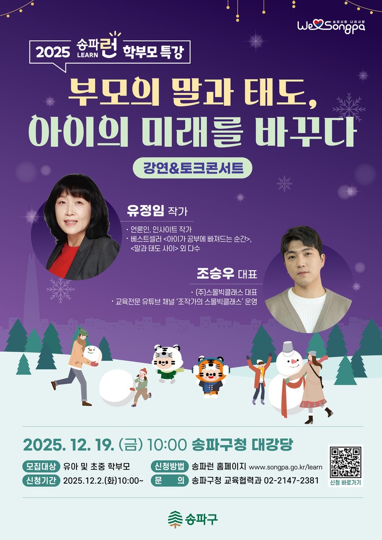 서강석 송파구청장은 “생애 첫 스승, 부모의 역할은 자녀의 성장 방향을 결정짓는 가장 중요한 요소”라며, “내년에도 아이들이 건강한 가정 속에서 올바르게 자라나도록 풍성한 강연을 제공하겠다”라고 전했다.