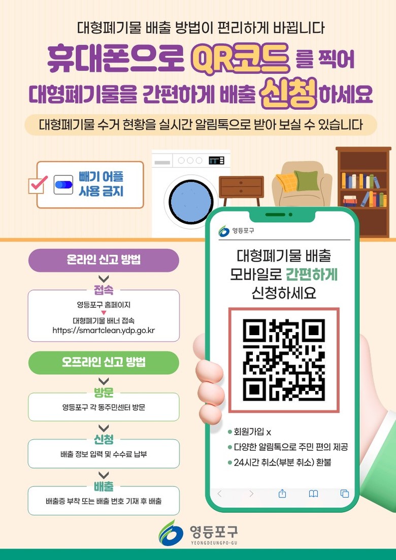 - 구청 누리집으로 온라인 창구 일원화…취소·환불 24시간 가능 [영등포구 세계타임즈=이장성 기자] 영등포구(구청장 최호권)가 대형폐기물 수거 과정에서 발생하던 처리 지연, 환불 등 구민 불편을 해소하기 위해 ‘대형폐기물 실시간 수거관리 시스템’을 도입하고 내년 1월부터 시행한다고 밝혔다.