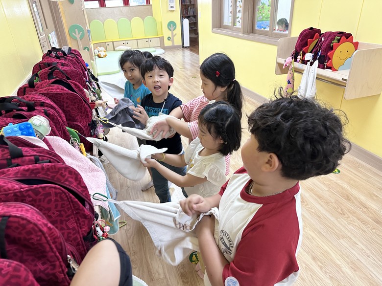 환경 주간(Eco-Cloud) 동안, 아이들은 손수건을 사용하며 불필요한 일회용 종이수건 사용을 줄이고(Re-duce:불필요한 것 줄이기), 손수건 사용 횟수를 코인으로 적립(Re-covery:에너지로 만들기)하여 물통 가방으로 교환(Re-use: 다시 사용하기)하였다. 그리고, 다양한 미술 재료로 나만의 물통 가방을 꾸민 후 바깥 놀이와 생태 놀이 활동 시 착용하여 재사용하였다(Re-cycle: 올바르게 재활용하기). 물통 가방을 꾸미며 아이들은 손수건 사용의 좋은 점과 불편했던 점, 그럼에도 불구하고 지구와 함께 살아가기 위해 우리가 생활 속에서 지킬 수 있는 점들을 이야기 나누고 가방에 글과 그림으로 표현하여, 생각(Re-think)을 담아 생태 시민의 실천 의지를 굳건히 하는 경험을 나누었다.