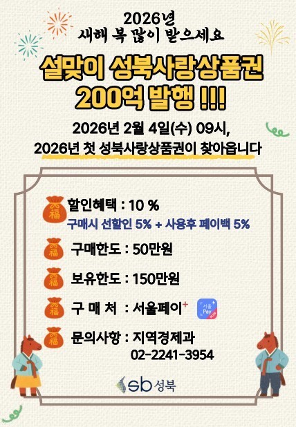 이승로 성북구청장은 “서울시 자치구 중 가장 먼저 발행을 시작해 설 명절 이전 성북 지역 내 소비를 촉진하는 계기가 될 것”이라며 “200억 원 규모의 성북사랑상품권 발행이 구민의 실질적인 경제 버팀목이 될 수 있도록 노력하겠다”고 말했다.