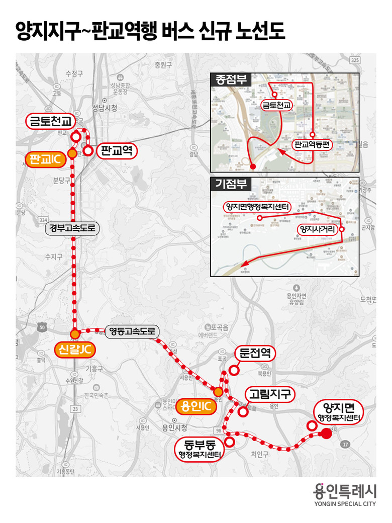 버스는 ▲양지면 행정복지센터 ▲양지사거리 ▲동부동 행정복지센터 ▲서울병원 ▲고림고‧유림2동 ▲유림동‧방축 ▲둔전역‧인정멜로디아파트 ▲금토천교 ▲판교역동편 등 정류소에 정차할 예정이다.