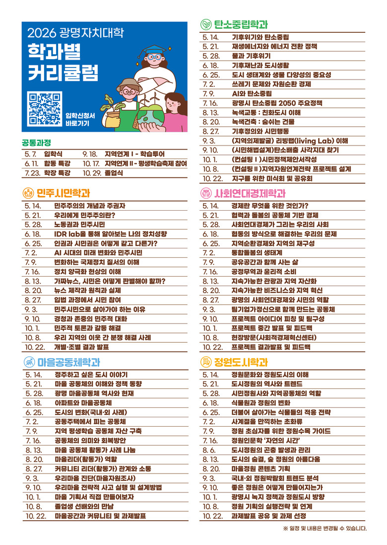 광명자치대학은 5월 7일 입학식을 시작으로 10월 29일 졸업식까지 총 20주, 60시간 동안 진행한다. 매 수업은 이론·토론·과제 중심으로 구성하며, 지역 활동 실습과 벤치마킹 등 현장 중심 과정으로 운영할 예정이다.