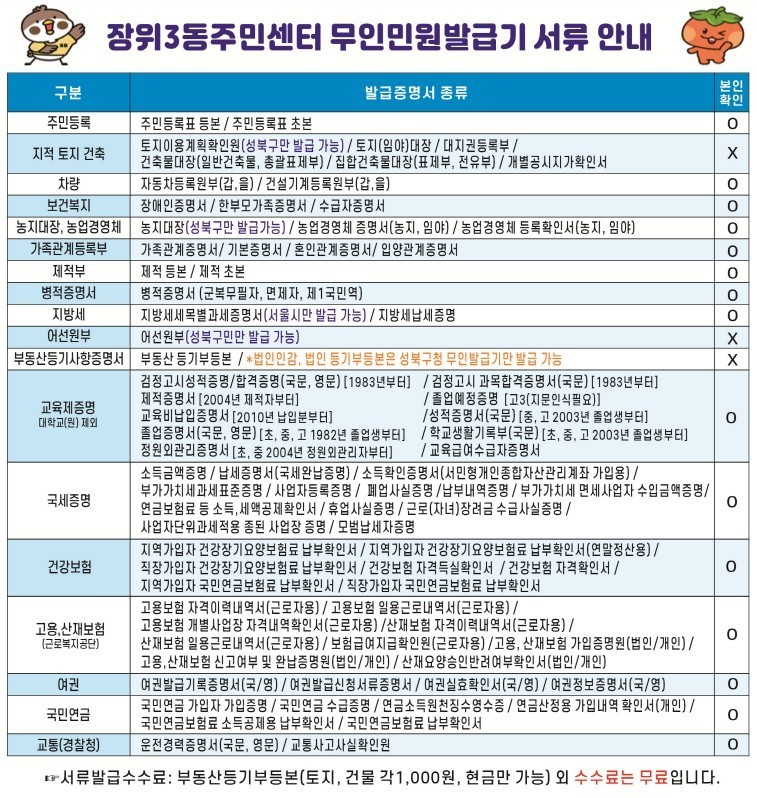 [성북구 세계타임즈=이장성 기자] 서울 성북구(구청장 이승로) 장위3동주민센터가 무인민원발급기 발급 서류 안내문을 제작·부착해 발급기 이용 활성화를 위한 홍보를 강화한다.