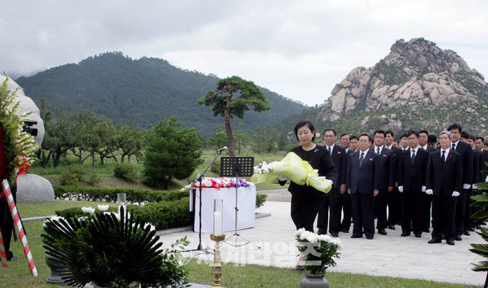 현정은 현대그룹 회장과 조건식 사장 등 현대아산 임직원들이 4일 금강산 현지에서 원동연 아태 부위원장 등 북측 관계자 20여명과 함께 故 정몽헌 회장 11주기 추모식을 진행하고 있다. 2014.08.04. (사진=현대그룹 제공)