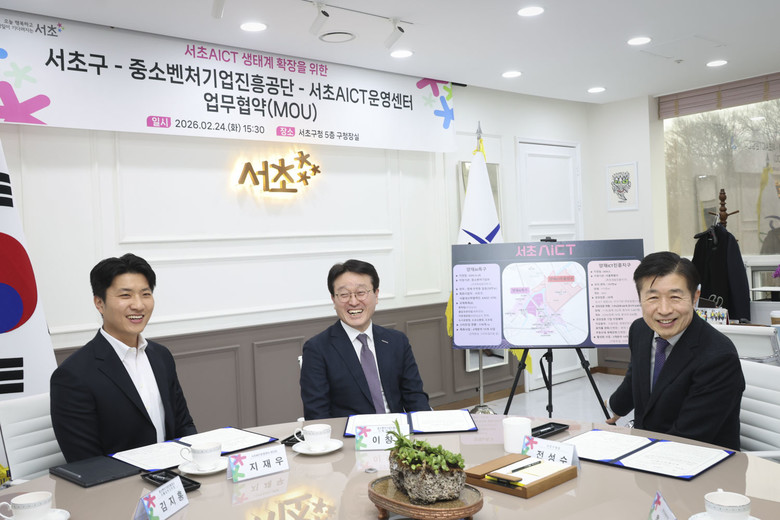 [서초구 세계타임즈=이장성 기자] 서울 서초구(구청장 전성수)는 24일 중소벤처기업진흥공단, 서초AICT운영센터와 3자 업무협약을 체결하며 서초AICT 내 인공지능(AI), 정보통신기술(ICT) 분야 중소·벤처기업의 육성과 혁신 생태계 조성에 힘을 모으기로 했다.