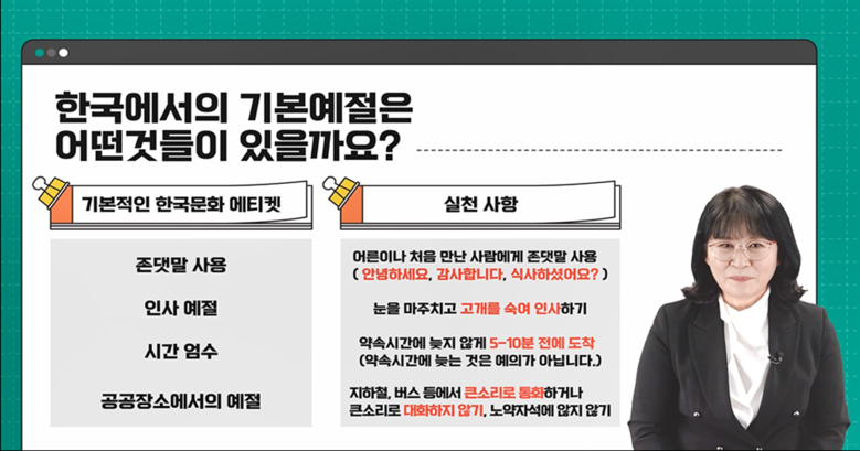 콘텐츠는 기본예절, 식당 및 공장 아르바이트, 생활안전(화재, 심폐소생술) 등 총 5차시로 구성되어 있으며, 안전분야 전문강사가 실제 사례 중심으로 강의를 진행한다. 또한, 영어·중국어·베트남어 등 3개 언어로 AI 더빙을 진행하여, 다양한 국적의 유학생들이 자막 없이도 쉽게 이해하고 학습할 수 있도록 제작되었다.
