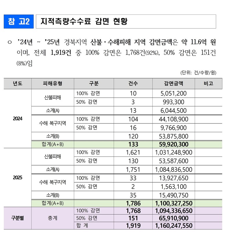2024년부터 도내 대형산불, 수해피해 등으로 인한 특별재난지역의 지적측량수수료 감면 현황은 전체 1,919건 중 주거용 주택 등(100% 감면) 1,768건, 그 외의 경우(50% 감면) 151건이다.